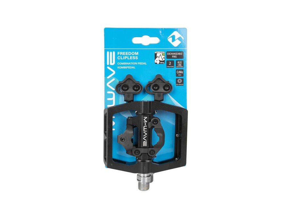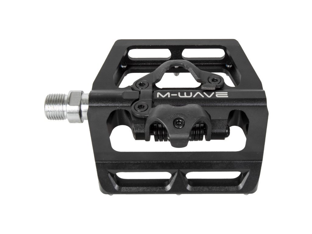 Pedály na horské kolo M-Wave Freedom nabízí z jedné strany širokou platformu pro dobré držení tenisky a z druhé strany nášlapný systém.